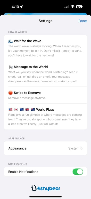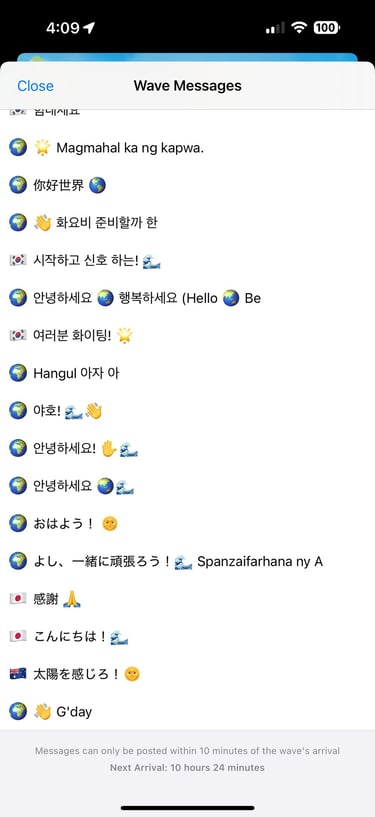 When the wave reaches your location, join the moment by sharing a single message. Your contribution is special, as messages fade away when the wave moves on, creating a fresh, live experience every cycle.